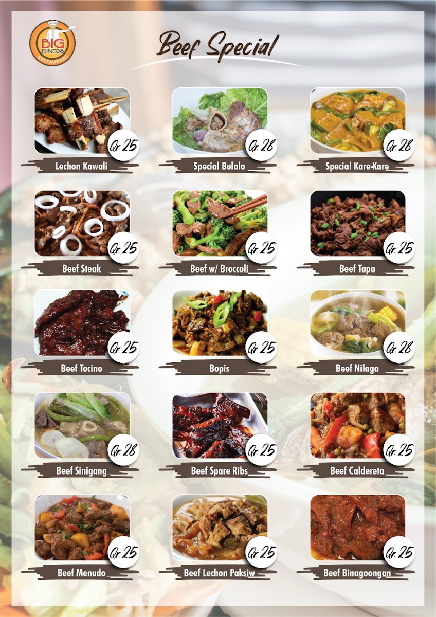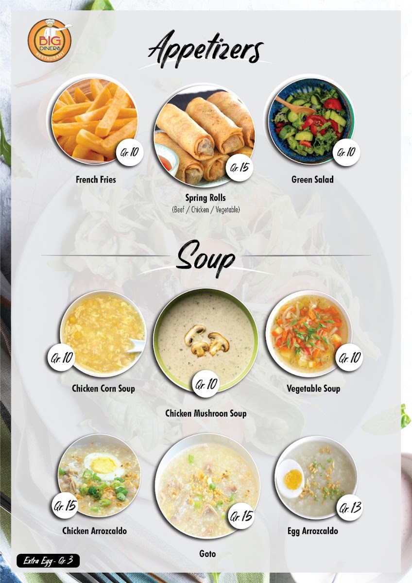 Welcome to BIG DINERS Restaurant, located at the Chairmen Hotel in Doha, Qatar, where an authentic Filipino dining experience awaits. Our menu showcases a delightful array of dishes designed to satisfy every palate. Start your meal with our golden crisp French Fries or indulge in our flavorful Spring Rolls, available in both chicken and vegetable options.